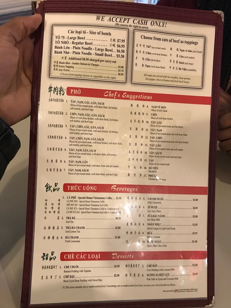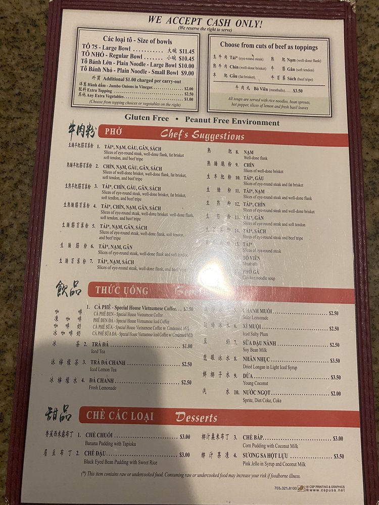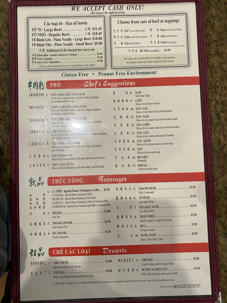 Introducing the menu at Pho 75 Arlington, a Vietnamese eatery in Arlington, VA, where simplicity and quality define the dining experience. The focus here is on their specialty, Pho noodle soup, which comes in various options featuring different cuts of beef or chicken. The menu is concise, highlighting the essence of Vietnamese cuisine with dishes like eye round and meatball Pho. The broth is rich and flavorful, accompanied by perfectly cooked noodles and tender beef. Customize your soup with hoisin and hot sauce, herbs, and sprouts for a personalized touch. Despite the no-frills atmosphere, the emphasis on quality ingredients and quick service stands out. Pho 75 Arlington is a go-to spot for a comforting and satisfying meal that captures the essence of authentic Vietnamese flavors.